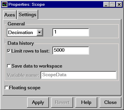 Mit einem Klick auf den "Settings"-Reiter kommen weitere Parameter zum Vorschein, von denen hier nur der Punkt "Save data to workspace" näher betrachtet werden soll.