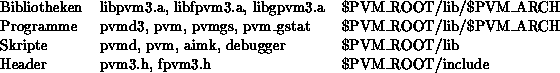 Wie oben schon angedeutet, wird PVM von jetzt ab unter PVM_ROOT=/progsys/pvm3 installiert. Dort liegen alle relevanten Programme, Bibliotheken und Header. Im einzelnen sind dies: